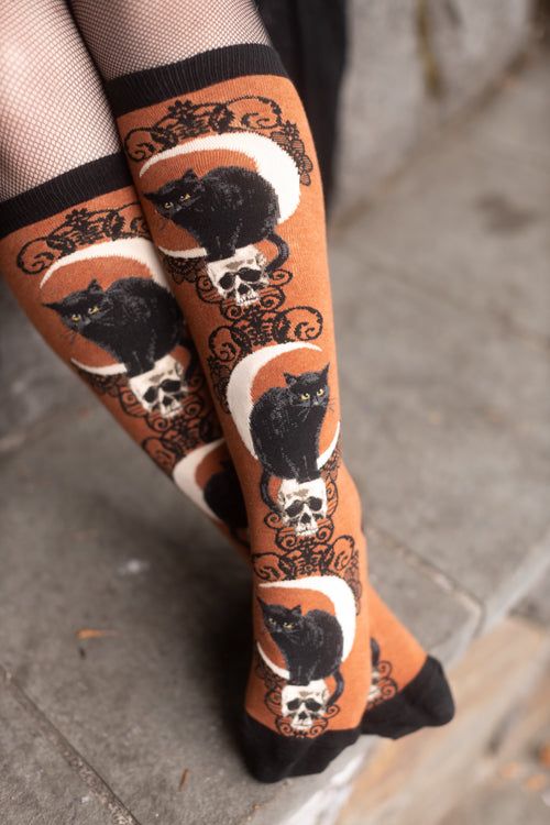 A black cat perches atop a grinning skull, backed by a crescent moon, while lacy black designs add refined gothic charm to these knee high cotton socks!