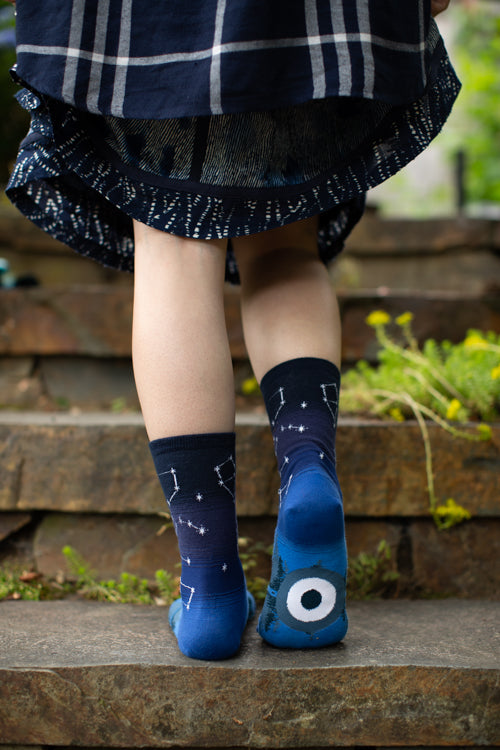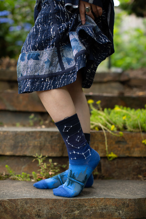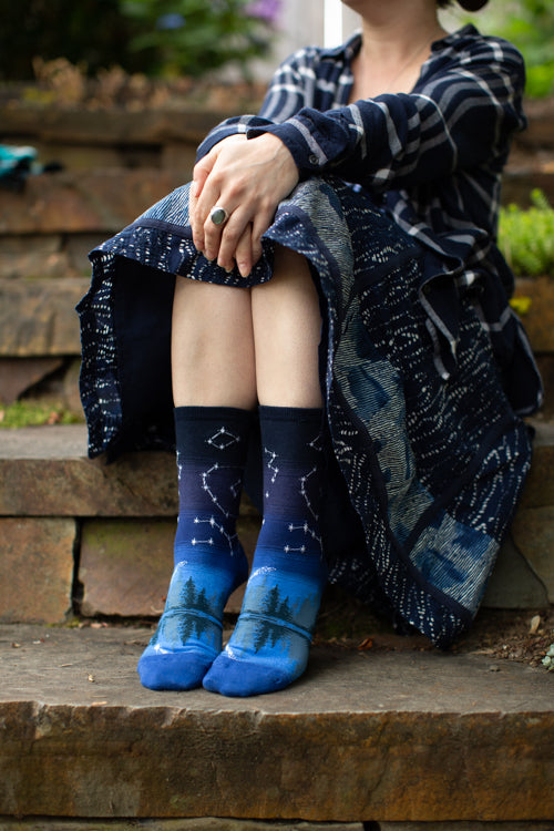 The summer constellations of the northern hemisphere are beautifully overlaid on a blue gradient sky. Below, an evergreen treeline is reflected in the calm, dark waters of a lake, reminding us of peaceful summer nights spent stargazing in our (and Mod Socks’) beloved home — the Pacific Northwest. How many constellations can you name